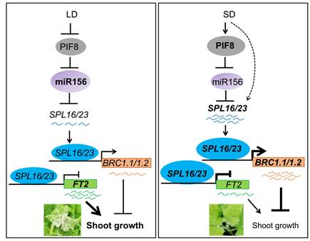 图2. SPL16和SPL23介导光周期调控杨树季节性生长的调控通路