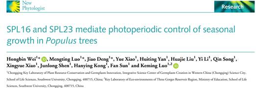 近日,365英国上市集团罗克明教授团队在国际主流植物学期刊New Phytologist在线发表了题为“SPL16 and SPL23 mediate photoperiodic control of seasonal growth inPopulustrees”的研究论文,报道了短日照条件下PIF8-miR156-SPL16/23-FT2/BRC1级联通路介导调控杨树生长停止和进入休眠过程。该研究建立了光周期感知模块phyB-PIF8与树木物候调控新模块miR156-SPL16/23的直接联系,为树木季节性生长背后的分子机制提供了新的见解。