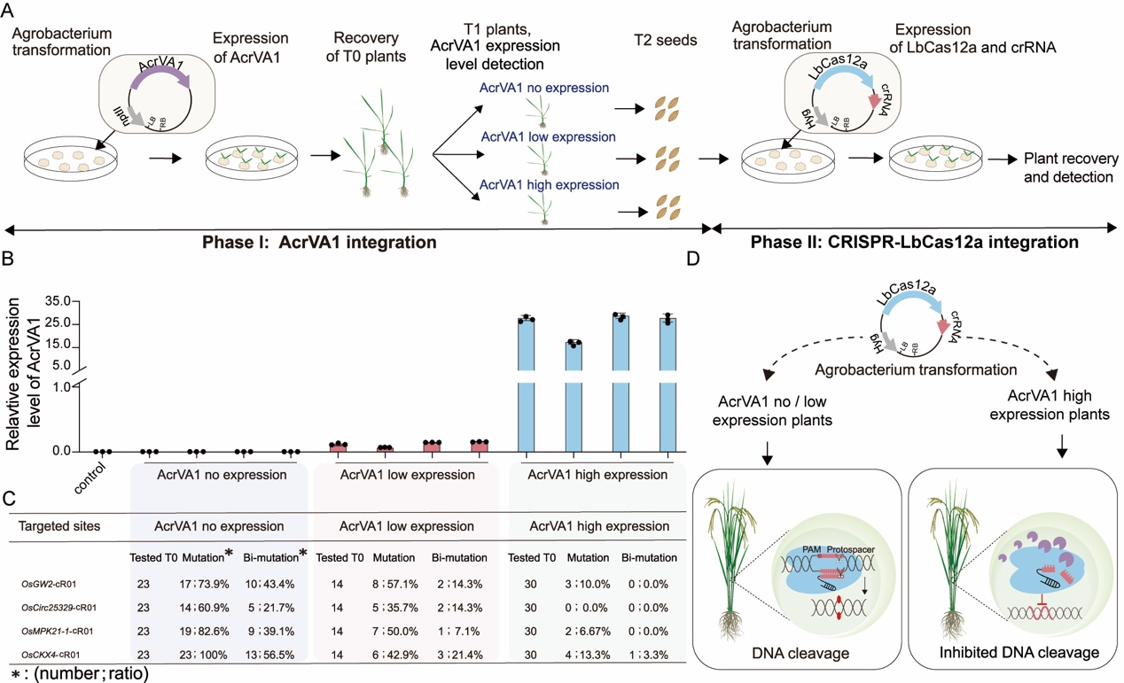 利用AcrVA1对LbCas12a基因编辑系统的抑制特性,作者通过顺序转化法在水稻中微调LbCas12a基因编辑效率(图4A)。首先筛选出稳定表达AcrVA1的水稻,然后这些植株再次转化以引入CRISPR-LbCas12a编辑系统(图4A和4B)。分析显示,AcrVA1的表达水平与基因编辑效率成反比,高表达AcrVA1的植株编辑效率大幅下降(图4C)。这表明AcrVA1能显著调节基因编辑特异性和效率,为提高基因编辑的精确度提供了新策略(图4D)。
