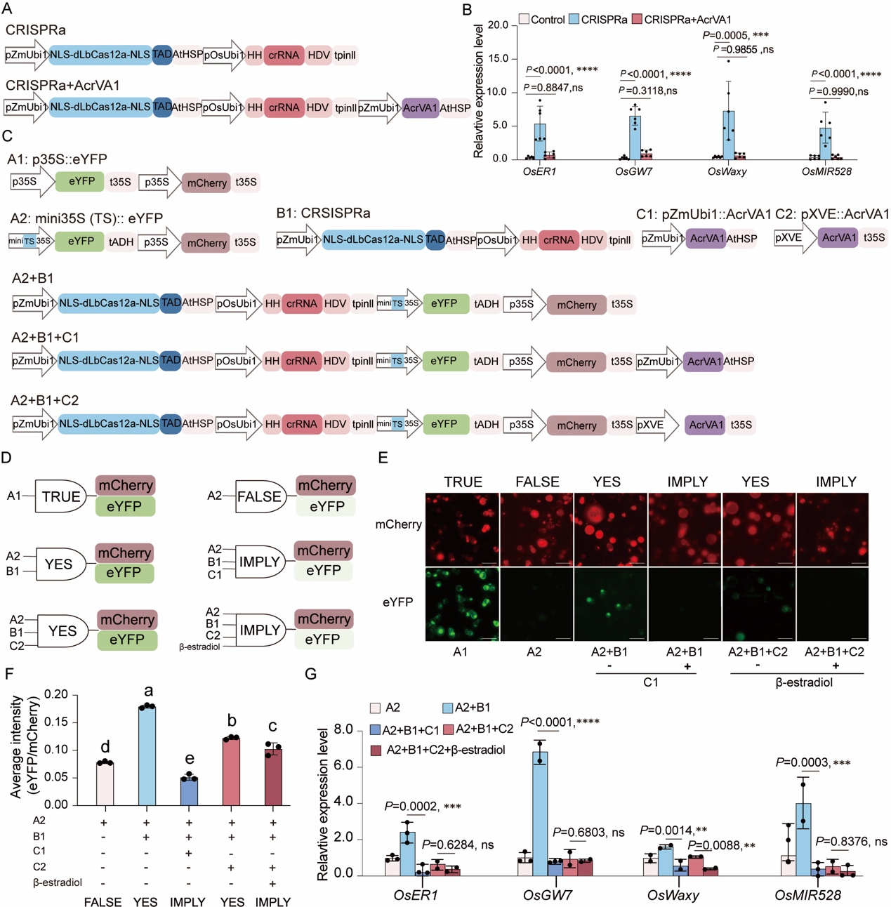 Cas12a因其T-rich PAM需求而成为高效的转录调控工具。作者评估了AcrVA1对基于LbCas12a的转录激活系统(CRISPRa)的影响,在共表达AcrVA1时,CRISPRa系统无法激活四个独立内源基因的表达,表明AcrVA1对CRISPRa有强烈的抑制作用(图6A和6B)。进一步地,作者尝试在植物细胞中通过精细控制CRISPRa及AcrVA1蛋白来设计植物合成遗传回路。作者设计了五种逻辑门组件,并基于组件设计了不同的合成遗传回路逻辑门(图6C和6D)。水稻原生质体实验显示,设计的逻辑门质粒产生的eYFP信号与预期的逻辑门功能一致,并可通过eYFP/mCherry荧光比值进行量化分析(图6E和6F)。作者还表达了针对OsER1、OsGW7、OsWaxy和OsMIR528启动子的crRNAs以实现转录激活调控。然而,作者发现在XVE启动子存在的情况下,无论是否添加β-雌二醇,CRISPRa都受到强烈抑制,这表明AcrVA1的泄漏表达对CRISPRa的干扰作用较强(图6G)。