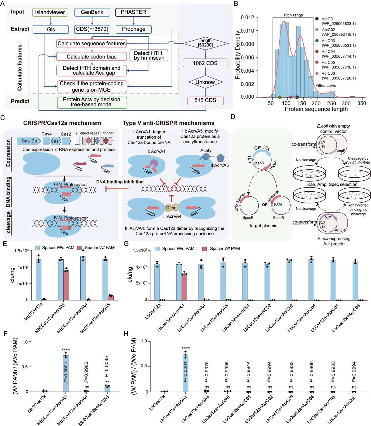 为了识别新的Anti-CRISPR(Acr)基因,作者开发了一个整合了五个特征的决策树模型(图1A)在细菌中鉴定出六个与已鉴定Acr蛋白典型范围分布重叠的候选新Acr基因(图1B),进一步应用质粒干扰实验在大肠杆菌中研究不同Acr蛋白对Mb2Cas12a和LbCas12a的抑制效果(图1D)。实验结果表明,对于Mb2Cas12a,AcrVA1显示出最明显的抑制效果,其次是AcrVA5,而AcrVA4在大肠杆菌中几乎没有显示出任何抑制活性(Fig. 1E和1F);LbCas12a被AcrVA1强烈抑制,其余Acr蛋白在大肠杆菌中未能显示出抑制活性(Fig. 1G和1H)。