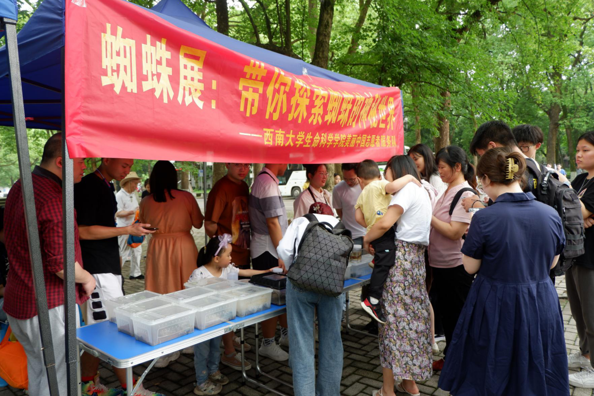 活动一开始,形态各异的蜘蛛们就吸引了许多人前来参观。许多同学一开始只敢远远地看两眼,对蜘蛛唯恐避之不及。但在工作人员的引导之下,他们逐渐敢上前观察,并轻轻触摸蜘蛛,更有一些胆大的同学,能够接过讲解人员手中的蜘蛛,与可爱的蜘蛛“亲密接触”。