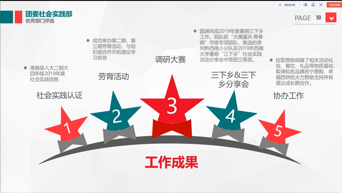 团委新媒体中心首先展示了他们的部门风采。打造独具生科特色的微信公众平台,紧跟疫情时事、开设疫情特辑,他们摆出大量数据展现他们一年以来的努力。一张张精美的海报、一个个漂亮的展板,一个个精致的道具,都承载着团委宣传部的心血,体现了他们为同学服务的极高热情。成员们从最初的零基础,到最后都能熟练运用技术做出精美的海报展板,见证了他们在这温暖的大家庭中不断成长、不断创新,并为其注入新鲜活力。综合办公室在顾全大局的同时也不放过任何一个细节,作为部门间的枢纽,充分发挥监督和保障功能,成为“公司-员工会-班级”之间沟通的重要桥梁。在这充实的一年中,团委社会实践部也寻找到属于自己的发展方向:将轻松友爱的部门氛围和不断地反思总结融入到日常工作中,使他们在劳育活动、调研大赛以及三下乡等活动中取得更加优异的成绩,赢得了大家的点赞。