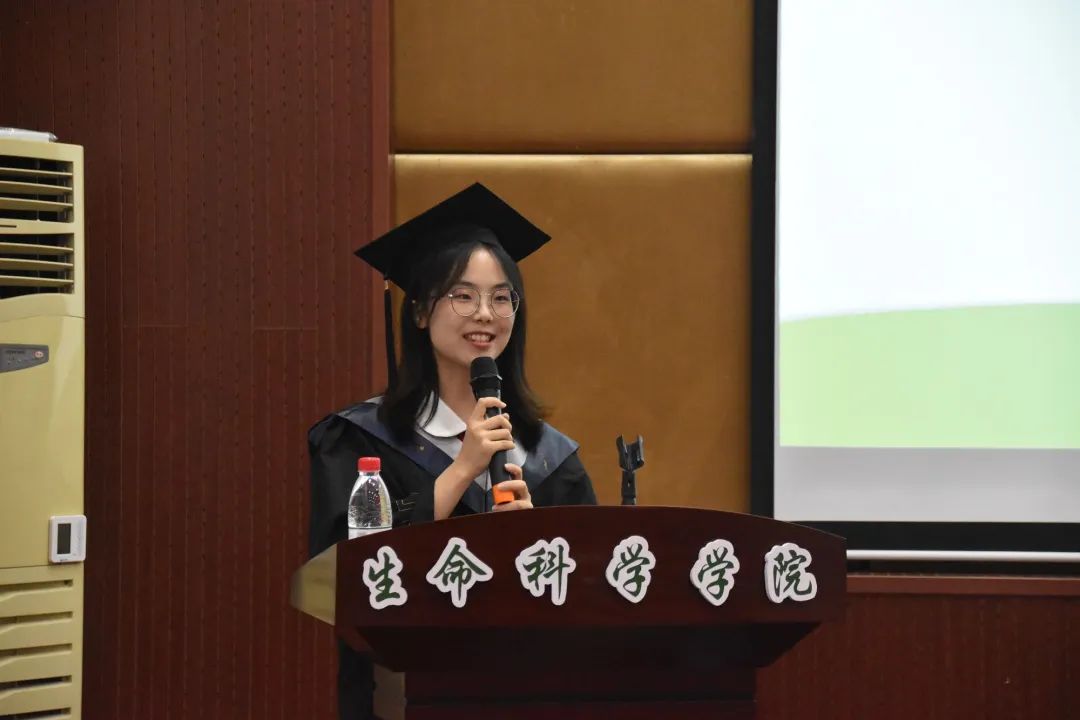 2018级生物科学(师范)专业曹玲同学作为毕业本科生代表发言,从“收获学识”、“遇见恩师”、“结识良友”、“成为更好的自己”四个层面分享感悟,表达了对母院的不舍和对恩师的感激,号召全体毕业生同学们继续追寻光、奉献爱。