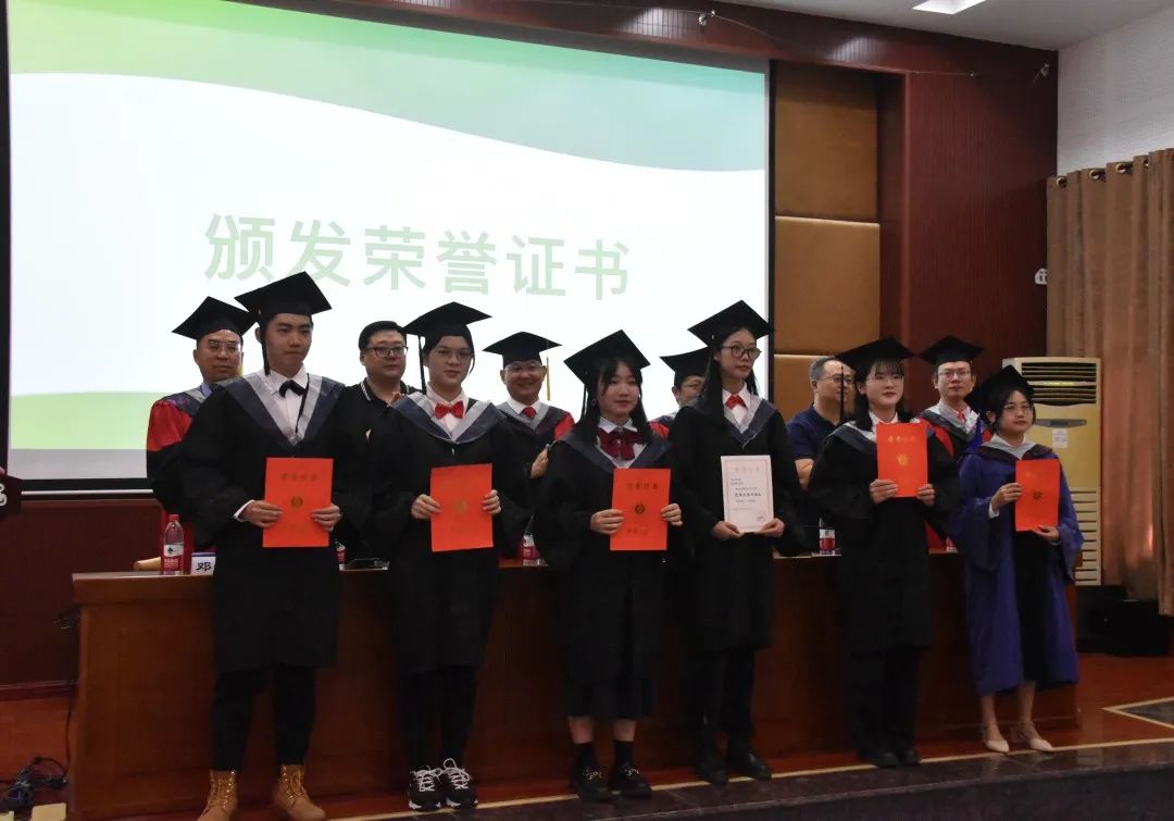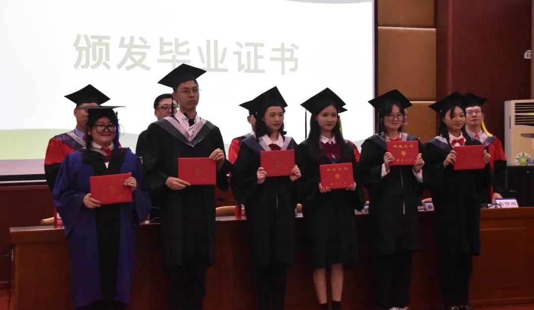在热烈高昂的音乐声中,主席台领导及嘉宾为毕业生代表颁发毕业证书,为获表彰的毕业生代表颁发荣誉证书。