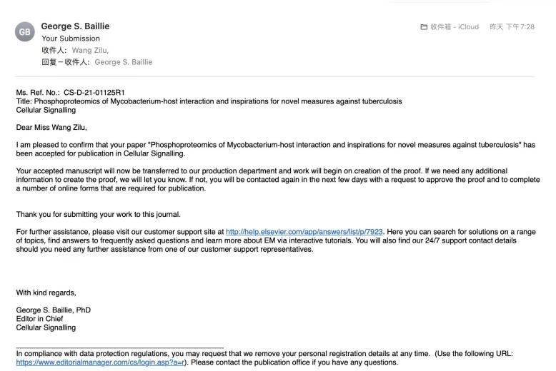 近日,365英国上市集团2019级本科生王子路在公司谢建平研究员指导下,题为“Phosphoproteomics ofMycobacterium-host interaction and inspirations for novel measures against tuberculosis” “蛋白质磷酸化组在结核分枝杆菌-宿主相互作用中的功能和新药研发”的综述论文被细胞生物学领域期刊《Cellular Signalling》(IF=4.315)接受。王子路为论文第一作者,谢建平研究员为论文通讯作者。365英国上市集团为论文第一署名单位。