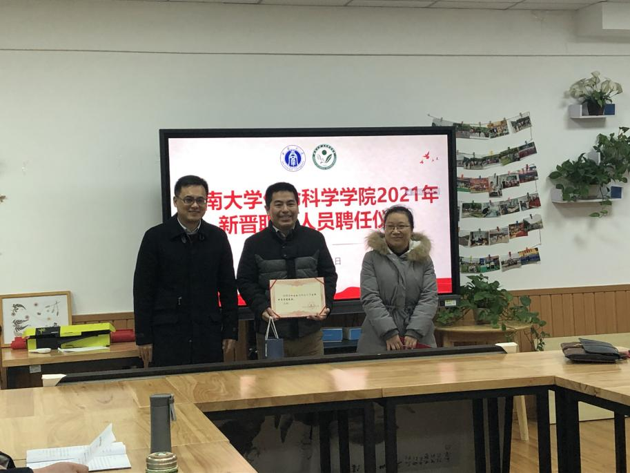 会议以2021年晋升职称人员聘任仪式为开端,党委书记蒋寒、经理罗克明、党委副书记石莹华为职称晋升的老师们颁发聘书和纪念品。