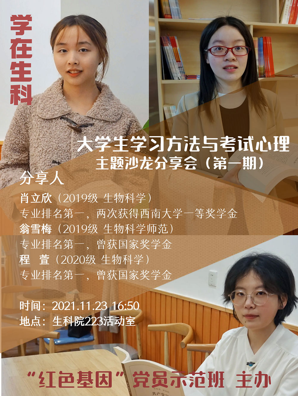 2020级生物科学专业国家奖学金获得者程萱同学从时间管理讲起,结合自身学习和工作体悟,她给同学们提出五点建议:早睡早起、列出计划、杜绝游戏、集中精力和团建活动,同时,她建议同学们要做好预习和复习工作,特别是要善于总结,明确重点,认真做题,及时反思。2019级生物科学(师范)专业国家奖学金获得者翁雪梅同学则详细分享了自己的学习方法,她着重从笔记整理的角度阐述,图文并茂向大家展示了自己列表式、思维导图式、问答式和PPT式的笔记整理方式。2019级生物科学专业校一等奖学金获得者肖立欣同学则用风趣幽默的语言,向大家分享了自己的学习与考试心态,她从四个方面给同学们提出建议:一是做好自己,努力实现个人进步;二是学习善于交流,有问题及时向老师或者其他同学求助;三是正确看待考试成绩;四是希望大家相信“天道酬勤”。