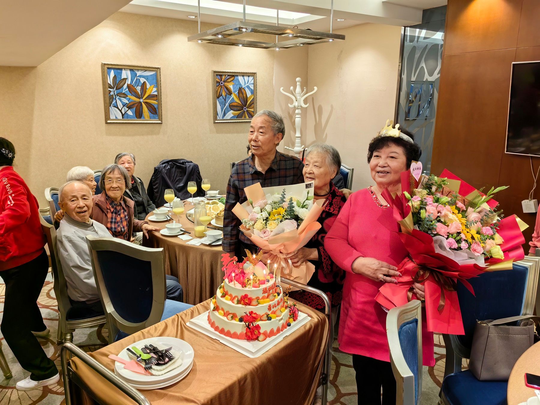 节日当天正逢退休老师文宗晞老师八十岁生日,全体参会人员对文老师以及当月过八十大寿的陈明树老师、周业敏老师送上生日祝福。